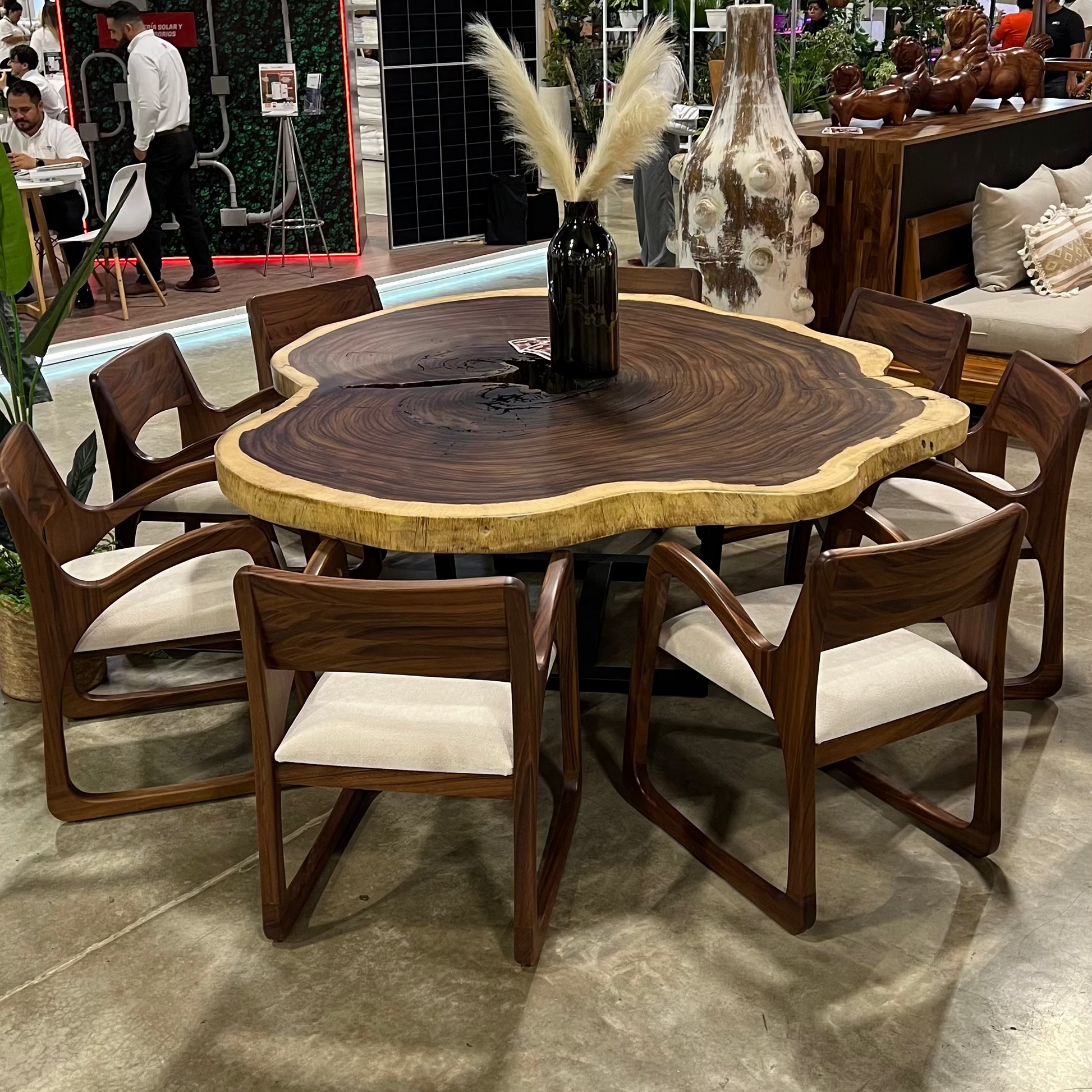 Mesa fabricada en Rodaja de parota estufada, la medida de la cubierta varia dependiendo del numero de sillas. Base a elegir, base en PTR 3 pulgadas.